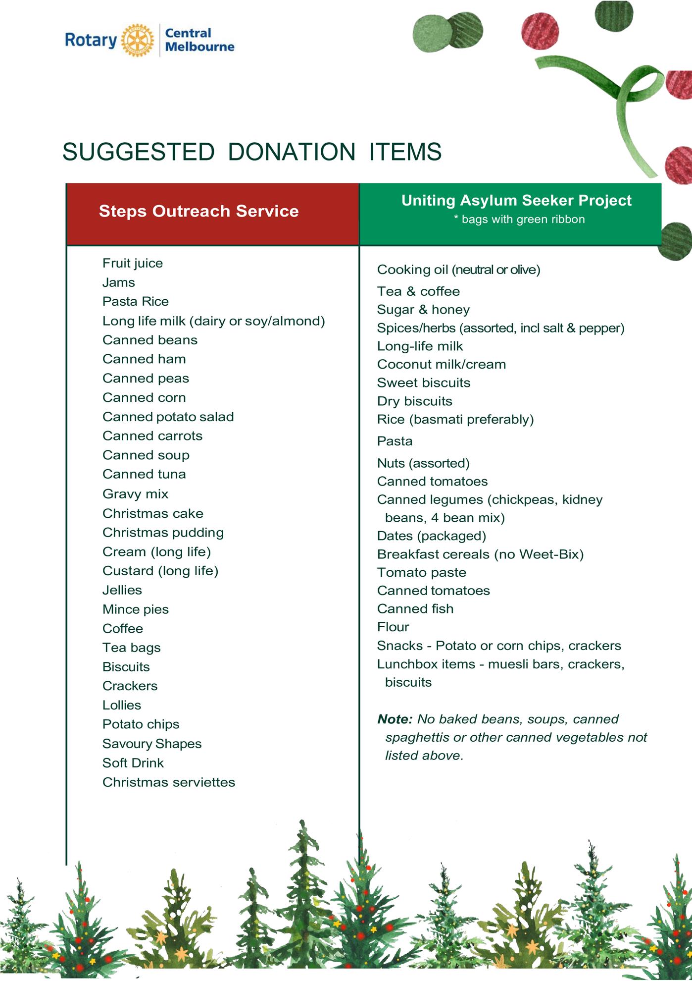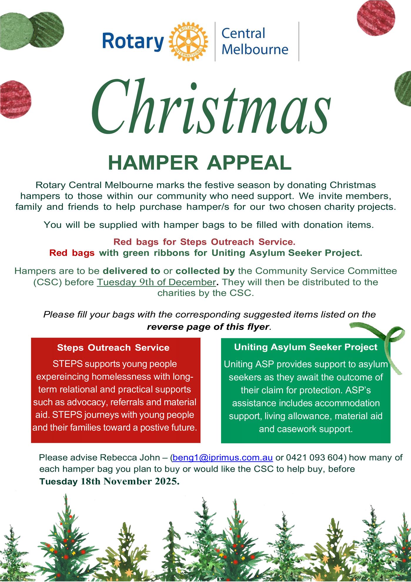 As referred to in a recent email, members and friends are invited to take part in Rotary Central Melbourne's annual Christmas Hamper Appeal by filling bags with specific grocery items for Steps Outreach Service and Uniting Asylum Seeker Project (please refer to the flyer).
